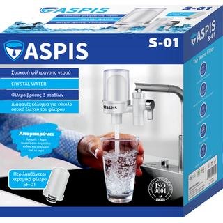 Φίλτρο βρύσης S-01 ASPIS σε λευκό χρώμα με διάφανο καπάκι για άμεσο έλεγχο φίλτρου.