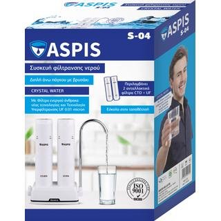 Η συσκευή φίλτρου βρύσης S-04 ASPIS διαθέτει δύο στάδια φιλτραρίσματος για καθαρό νερό χωρίς ιζήματα, χλώριο και ανεπιθύμητες οσμές. Τοποθετείται εύκολα επάνω στον πάγκο και προσφέρει εξαιρετικά αποτελέσματα φιλτραρίσματος.