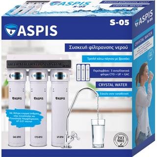 Η τριπλή συσκευή S-05 ASPIS διαθέτει τρία στάδια καθαρισμού που απομακρύνουν χημικά, ιζήματα, βαρέα μέταλλα και μικροοργανισμούς. Τοποθετείται κάτω από τον πάγκο και συνδέεται απευθείας με τη βρύση για συνεχή παροχή καθαρού νερού.